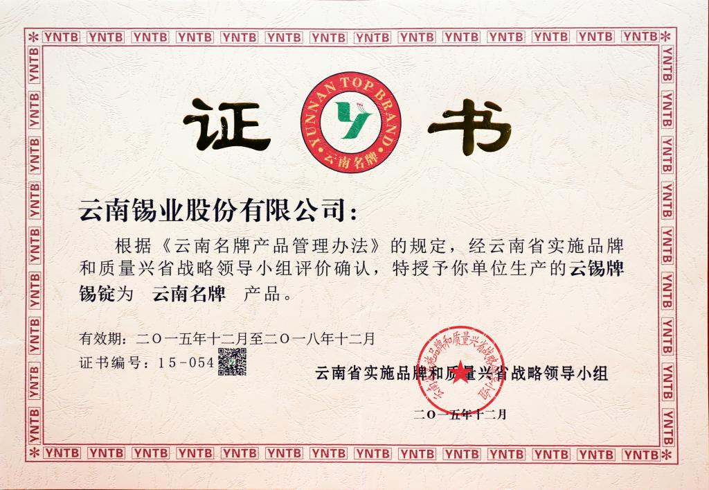 云錫牌錫錠為云南名牌產(chǎn)品