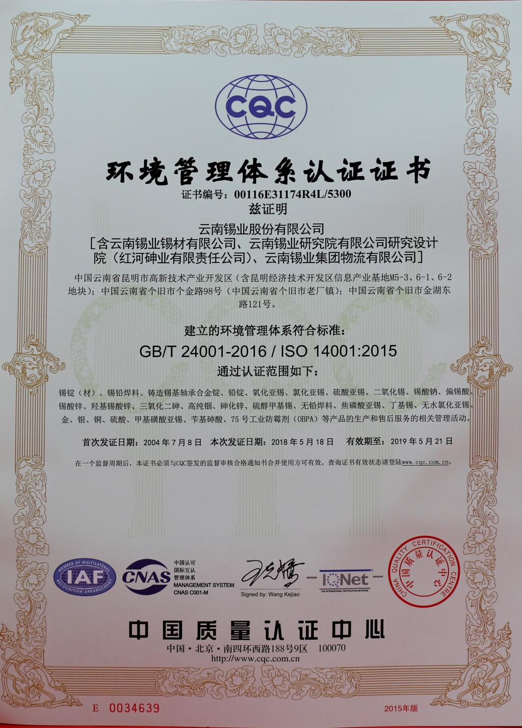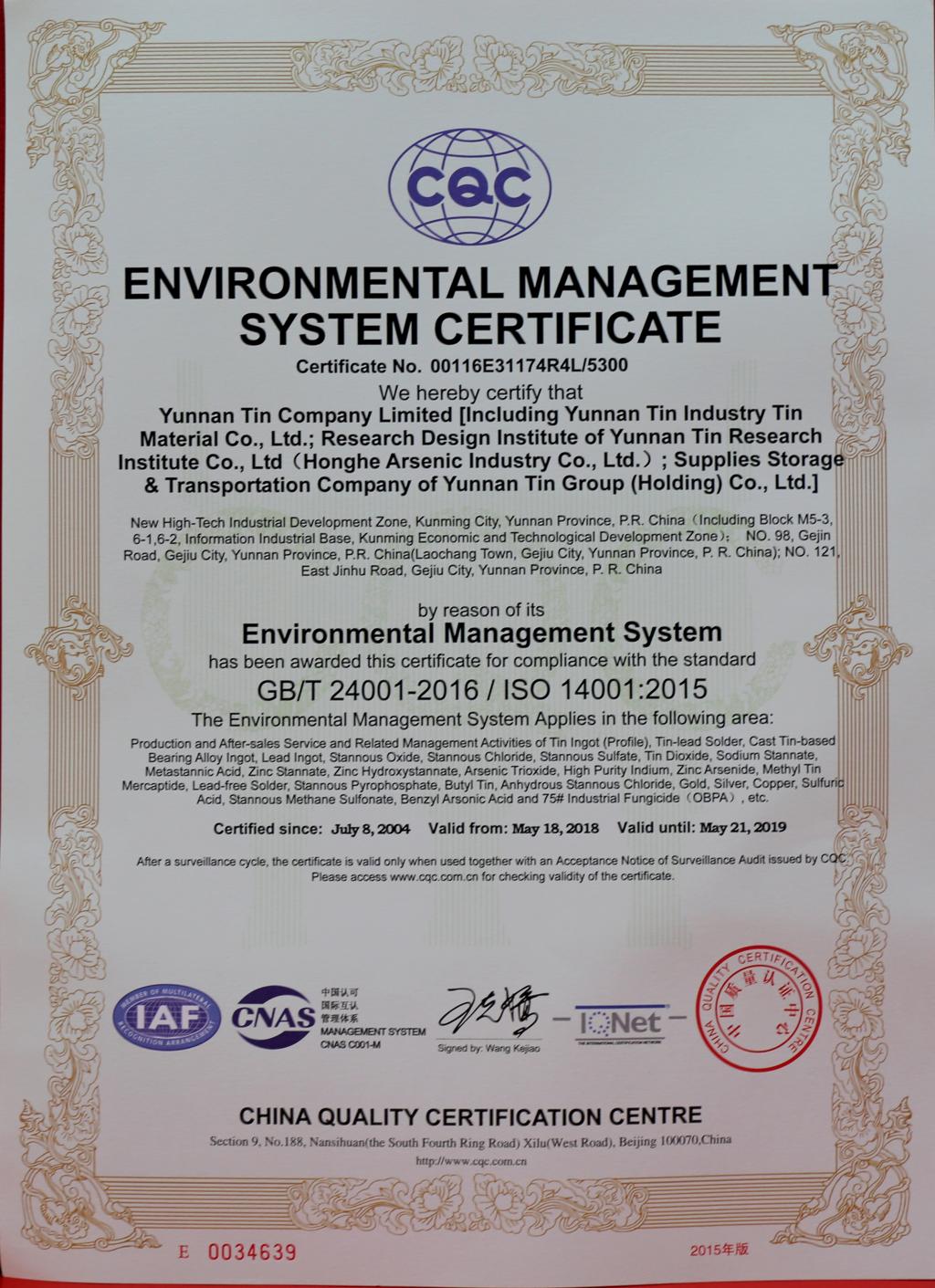 CQC環(huán)境管理體系認(rèn)證證書