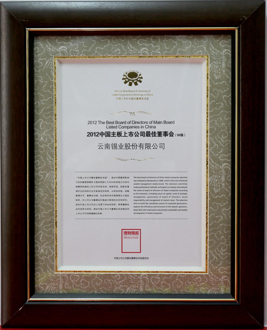 榮獲“2012中國主板上市公司最佳董事會(huì)”