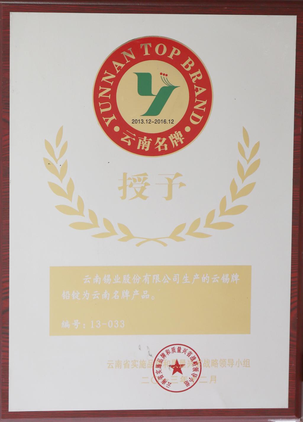 云錫牌鉛錠為云南名牌產(chǎn)品