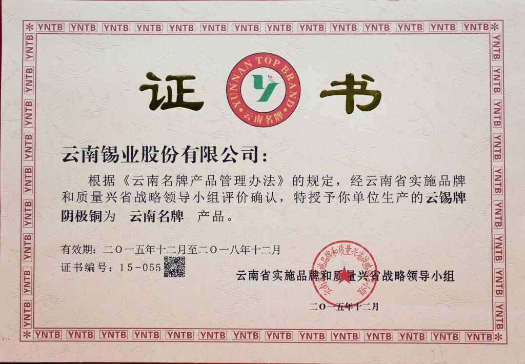 云錫牌陰極銅為云南名牌產(chǎn)品