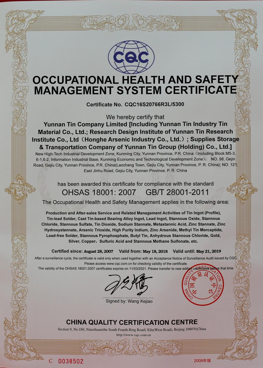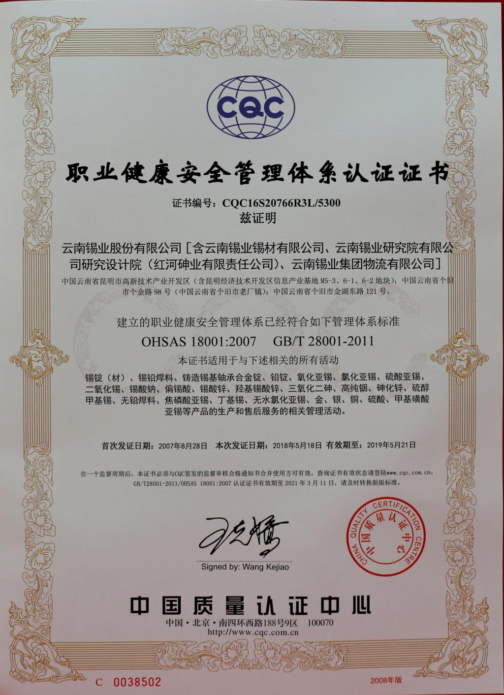 CQC職業(yè)健康安全管理體系認(rèn)證證書