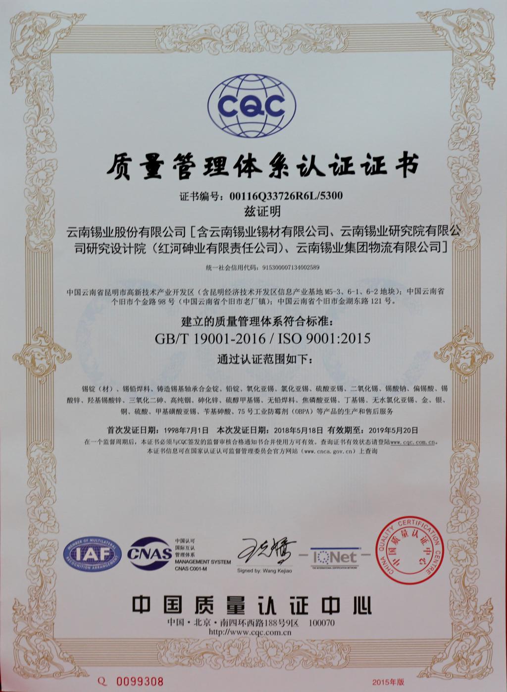 CQC質(zhì)量管理體系認(rèn)證證書