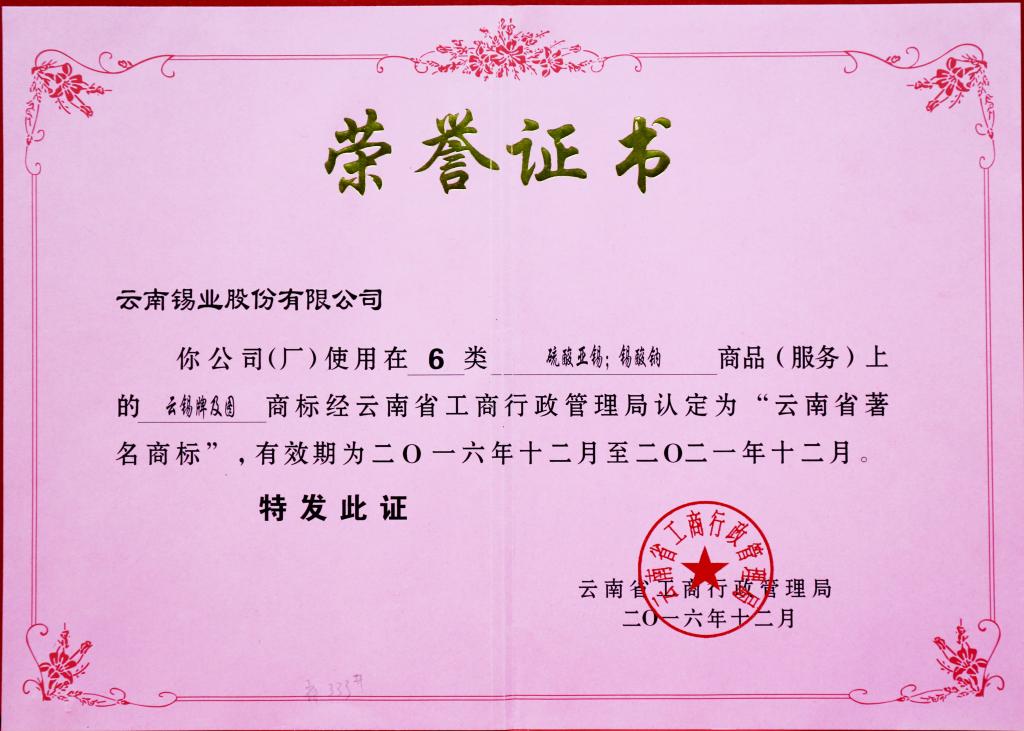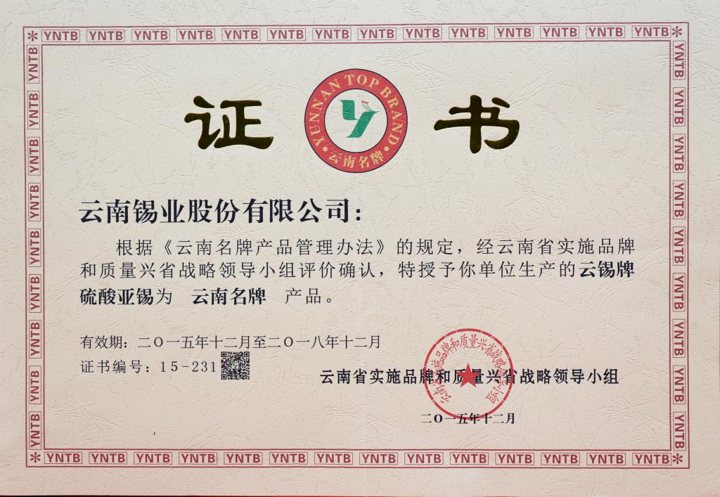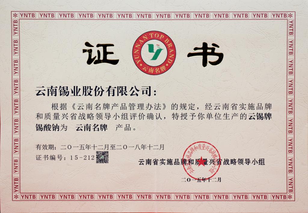 硫酸亞錫、錫酸鈉為云南省著名商標