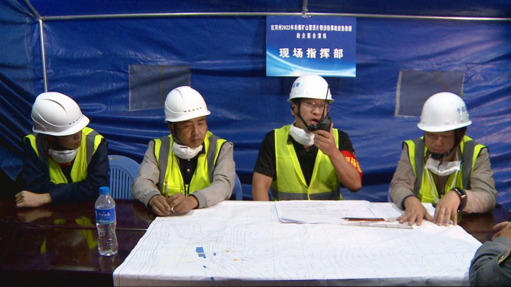 此次演練方式采取實地演練,即在實際環(huán)境下組織專項實兵演練,并采取單頻觀摩的方式進(jìn)行觀摩。“井下發(fā)生冒頂了,井下發(fā)生冒頂了,大家快撤,大家快撤……”井下值班長大聲叫到。演練模擬大屯錫礦1360坑450米探礦平巷掘進(jìn)迎頭外50米左右突然發(fā)生巷道頂板冒頂坍塌,并將巷道內(nèi)的風(fēng)管、水管、電話線、供電線路砸斷,巷道被垮落的支護(hù)、巖石堵塞,長度約10米左右,通過查看出入井記錄和人員定位系統(tǒng),核實單班入井人員共26人,安全出井23人,3名人員被困。大屯錫礦逐級上報,州政府應(yīng)急辦接報后遂啟動《紅河州非煤礦山生產(chǎn)安全事故應(yīng)急預(yù)案》,同時責(zé)成各相關(guān)部門、單位和救援隊趕赴事故現(xiàn)場展開救援。包括現(xiàn)場指揮、搶險救援、醫(yī)療衛(wèi)生、物資保障在內(nèi)的9個工作組經(jīng)短暫集結(jié)了解險情后,分別領(lǐng)命向事故地點(diǎn)進(jìn)發(fā)。與此同時,現(xiàn)場指揮部指揮長、個舊市副市長鄒文鴻等領(lǐng)導(dǎo),前往現(xiàn)場指揮部指揮救援工作的開展。