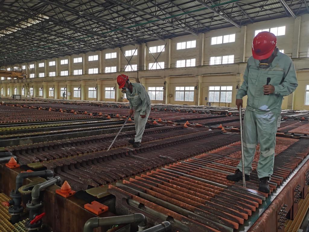“今天出裝槽班組的任務(wù)是出槽5系3、4組。”大家穿戴好勞動(dòng)防護(hù)用品,走向電解槽面,陽光從東面窗口斜射進(jìn)來,暖和的鋪在電解槽上,形成一道亮麗的風(fēng)景線,銅電解出裝槽班組員工一天的工作開始了。