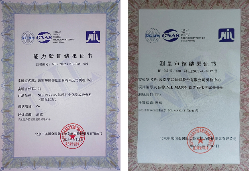 華聯(lián)鋅銦公司質檢中心于2022年5月參加北京中實國金實驗室能力驗證研究有限公司申報的國家級實驗室認可領域檢測項目,并順利通過鋅精礦、鐵礦石化學成分分析國際檢測認可。此次鋅精礦化學成分分析中Zn能力驗證國際比對,鐵礦石化學成分分析TFe測量審核,雙雙獲得評價結果為滿意的證書。