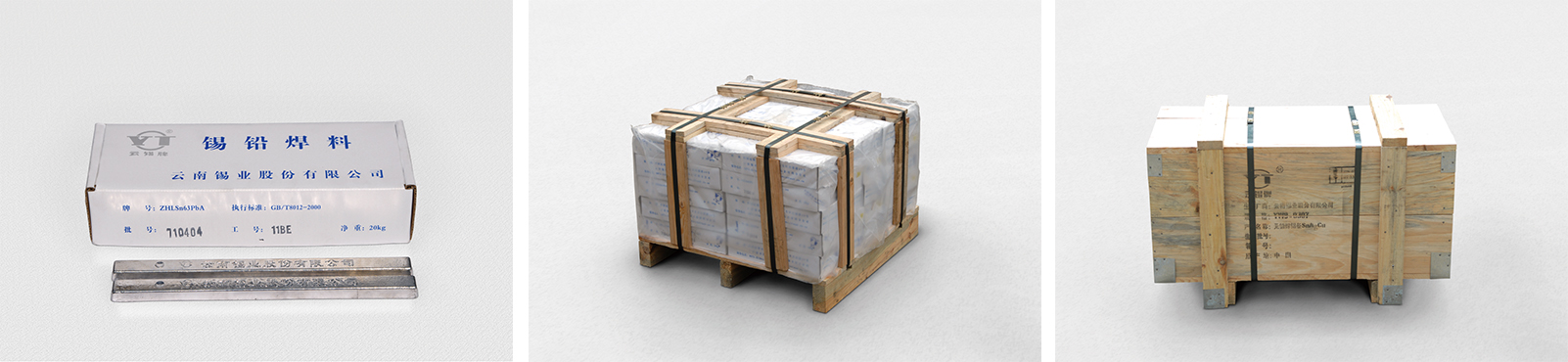 包裝:紙箱包裝,25 kg/箱和20 kg/箱; 40箱/捆和50箱/捆,重量為 1000 kg。錠形焊料為散裝或鋼帶捆扎,每錠重 25-27 kg,每捆重約1000 kg。